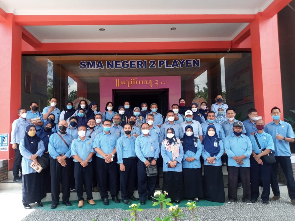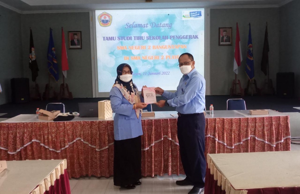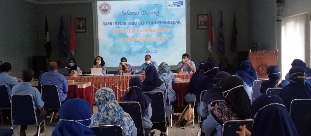 SMA Negeri 2 Playen bersama dengan 5 sekolah menengah lainnya di kabupaten Gunungkidul telah ditetapkan sebagai Sekolah Penggerak mulai tahun pelajaran 2021/2022. Sekolah Penggerak membawa amanah Pembelajaran paradigma baru di sekolah. Sebagai sekolah pelopor pertama kali pelaksanaan pembelajaran dengan paradigma baru, SMA 2 Playen menjadi acuan dan sumber referensi bagi sekolah – sekolah lain untuk menggali ilmu, pengalaman serta proses pembentukan kebijakan sekolah yang diterapkan. Selasa, 13 Januari 2022 SMA Negeri 2 Playen menerima kunjungan dari SMA Negeri 2 Banguntapan, Bantul dalam rangka melaksanakan kegiatan Studi Tiru tentang Program Sekolah Penggerak. Rombongan berjumlah 51 orang guru yang dipimpin langsung oleh Kepala SMA Negeri 2 Banguntapan, Trigiharto, S. Pd., M.Pd, yang disambut hangat oleh Kepala SMA Negeri 2 Playen Tumisih, S.Pd, M.Pd didampingi oleh tim Komite Pembelajaran Sekolah Penggerak. Studi Tiru diisi dengan paparan oleh Betty Sekarasih Hadi Yani, MPd B.I. Ketua Tim Komite Pembelajaran Sekolah Penggerak tentang Pengelolaan Sekolah Penggerak, Projek Penguatan Profil Pelajar Pancasila, kegiatan Festival Literasi Sekolah dan Program ROOTS Pencegahan Perundungan dan pemaparan Kurikulum Sekolah Penggerak oleh Tim Kurikulum. Setelah disajikan paparan dilanjutkan dengan tanya jawab dan diakhiri dengan penyerahan cindera mata. Kepala SMA Negeri 2 Playen menyerahkan cindera mata kepada Kepala SMA Negeri 2 Banguntapan berupa Buku Refleksi ‘ Aku, Muridku dan Pandemi’ karya 22 guru SMA Negeri 2 Playen dan buku karya kepala sekolah berjudul ‘ Langkah Kecil 30 Tahun’.