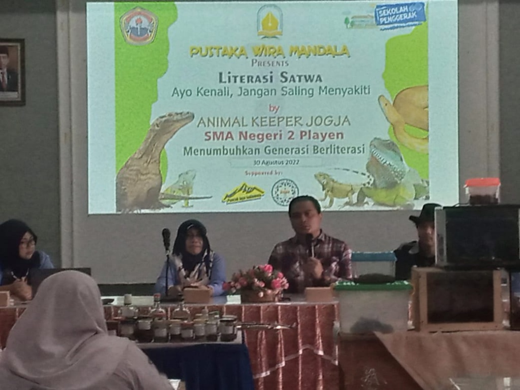 Kontur lingkungan sekolah seluas hampir 3,5 H tidak hanya menobatkan SMA Negeri 2 Playen menjadi Sekolah Hijau berwawasan lingkungan hidup yang sejuk namun juga memberikan sumber belajar fauna yang sangat beragam didalamnya. Wilayah sekolah yang berbatas sungai di sekeliling sekolah, kebun buah sekolah dan tanaman tanaman keras lainnya memungkinkan membuat kegiatan bertujuan literasi baru yang mempelajari kekayaan alam tersebut, golongan reptile khususnya. Perpustakaan sekolah Pustaka Wira Mandala menggandeng komunitas pecinta satwa Animal Keeper Jogjakarta (AKJ) bekerja sama dengan PT Puncak Jaya Indonesia (Spesialis Produk Literasi) memenuhi kebutuhan sekolah tersebut. Sejumlah 80 siswa dalam kelompok literasi Sekolah ‘Binar Mandala’ mengikuti dengan antusias acara tersebut pada Selasa, 30 Agustus 2022 lalu. Tim AKJ memperkenalkan berbagai jenis reptile , memberikan edukasi sekaligus demo teknis mengatasi gangguan yang muncul dari kelompok reptile yang mungkin muncul di wilayah sekolah. Peserta kegiatan literasi reptile diberikan kesempatan untuk bisa berinterksi langsung dengan reptile reptile yang dibawa ke sekolah dan mencoba memperlakukan mereka dengan cara yang benar dan tidak mengancam diri sendiri atau sekitarnya. Kurangnya edukasi yang tepat sangat mempengaruhi cara bertindak seseorang dalam menghadapi serangan atau kemunculan reptile di sekitar kita yang tidak semuanya membahayakan atau mematikan.