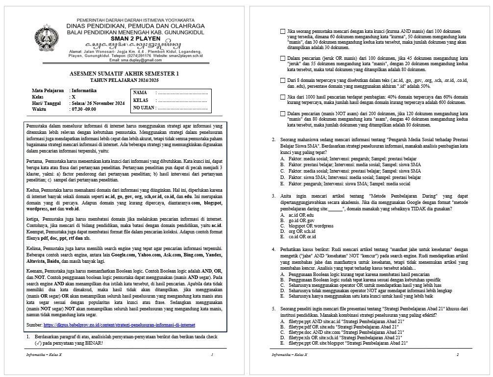 Asesmen Sumatif Akhir Semester 1 Tahun 2024/2025 di SMA Negeri 2 Playen Berjalan Lancar dengan Pendekatan Soal berbasis Literasi dan Numerasi
