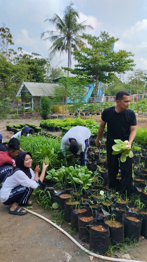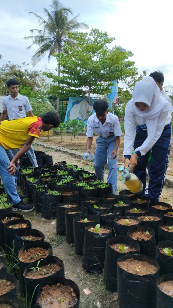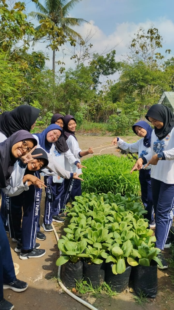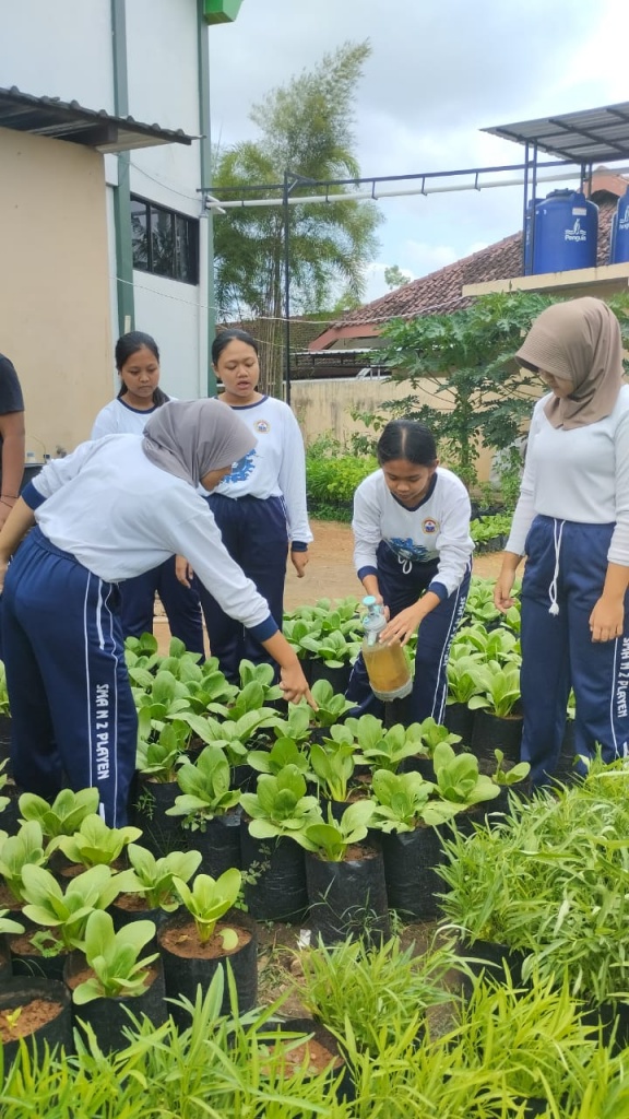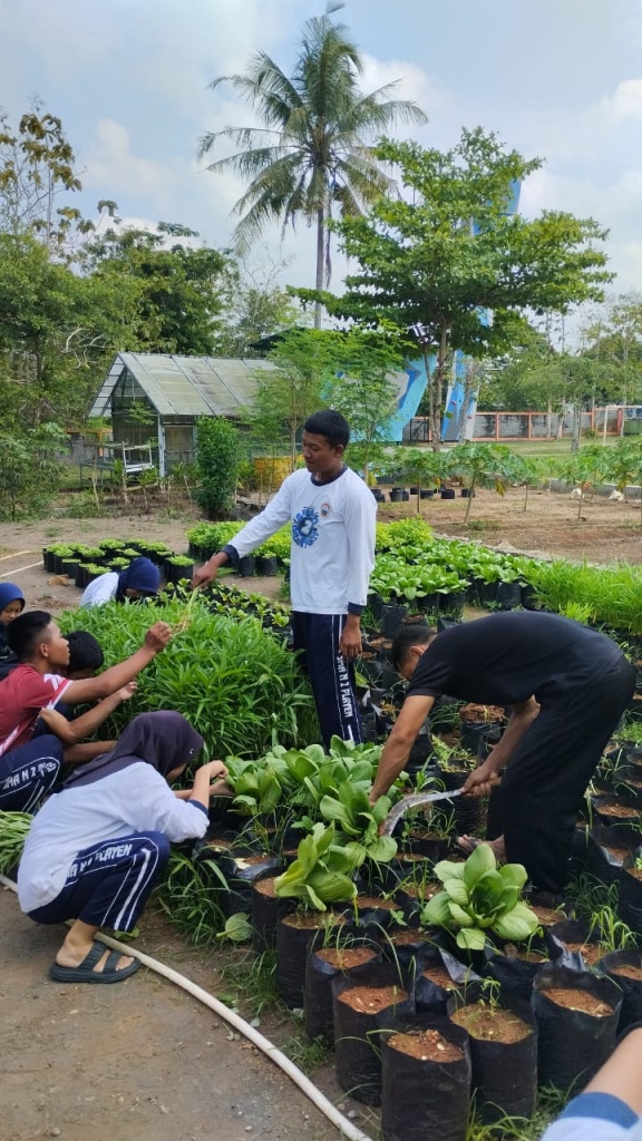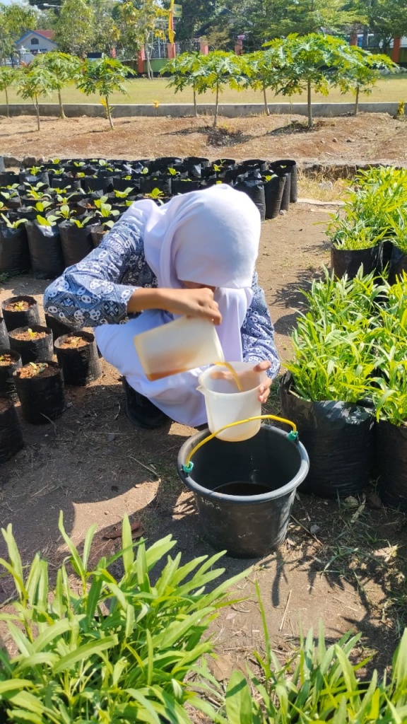 Setelah bibit siap pindah tanam, siswa melanjutkan ke tahap perawatan tanaman sayuran, yang meliputi penyiraman rutin, penyiangan gulma, dan pemantauan hama secara berkala. Dalam kegiatan ini, siswa tidak hanya belajar bertani, tetapi juga menerapkan prinsip pertanian ramah lingkungan dengan menggunakan Pupuk Organik Cair (POC) hasil olahan sendiri dari limbah dapur dan sisa bahan organik.